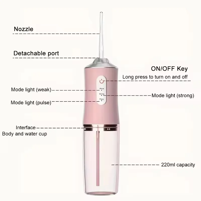 Convenient and Durable Design: The water jet toothpick is fully waterproof with an IPX7 rating, featuring a 220ml capacity water tank. This large tank size allows for extended use without needing a refill, making it ideal for daily oral care