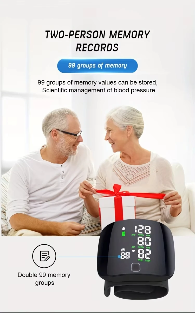 1. Rechargeable Battery: Long-lasting battery life with USB recharge capability 2. Compact and Portable Design: Lightweight and easy to carry anywhere. 3.Accurate Blood Pressure Monitoring: Equipped with advanced sensors for reliable readings. 4.User-Friendly Interface: Simple, intuitive controls for effortless operation. 5.Memory Storage Function: Saves previous readings for easy tracking of blood pressure trends. 6.Wrist-Cuff Design: Comfortable and adjustable for all wrist sizes. 7. Digital Display: Large, clear LCD screen for easy reading.